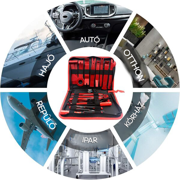 A készletben levő szerszámok: 38 darab (kárpit eltávolító szerszámok, klipsz eltávolító fogó, kaparó szerszám, kárpitos rögzítők eltávolítói, precíziós kampószedők, sztereó eltávolító szerszámok, autó csatlakozók).
